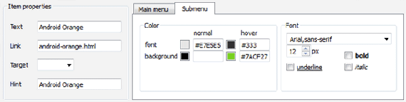 3.2. Select submenu's item by clicking it and change submenu's appearance for normal and hover states and set submenu's item link properties and link target attributes on the "Submenu" tab.